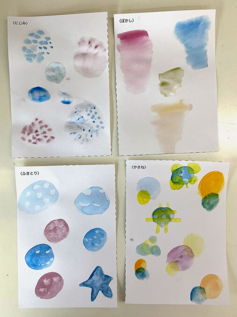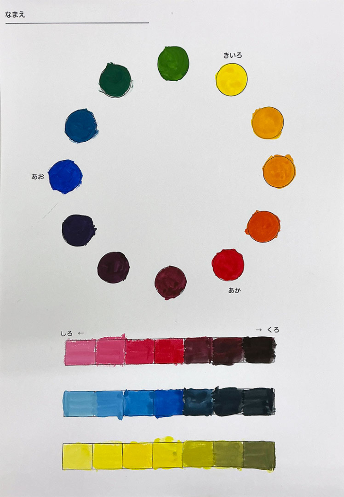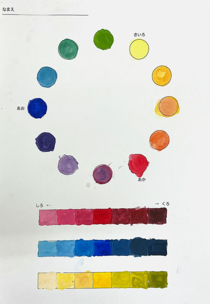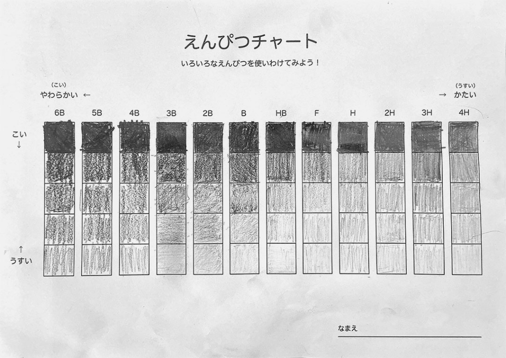 画像は4月カリキュラムの「カラーチャート&グラデーション/鉛筆の濃さを知ろう」のものです。「カラーチャート&グラデーション」では、色の混ぜ方、塗り方もしっかりと目標を持ってやっているのが伝わってきます。時間に余裕のあった子は「水彩技法」にも取り組みました。「鉛筆の濃さを知ろう」では鉛筆の種類によって色味が違うことを体験することで、今後、鉛筆デッサンに取り組むきっかけになればと思っています。