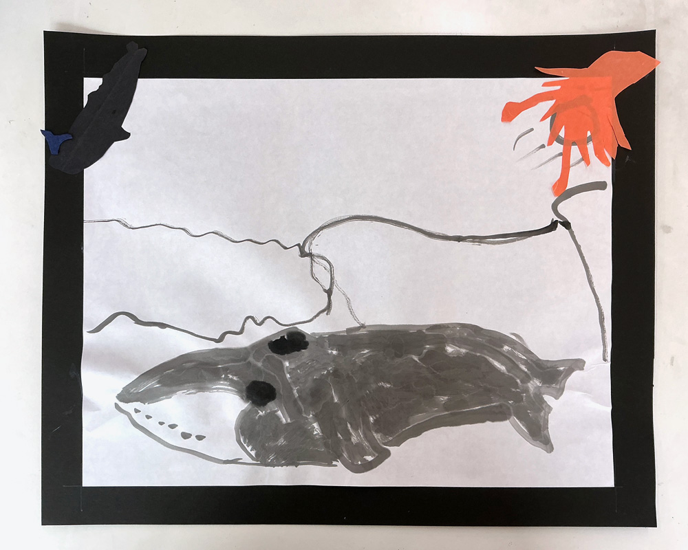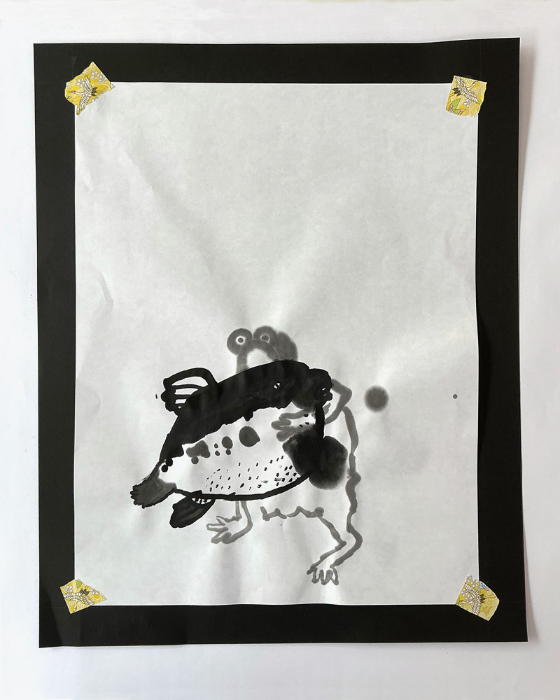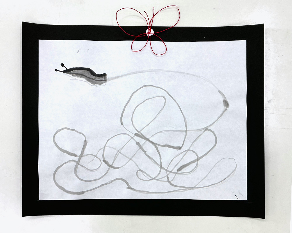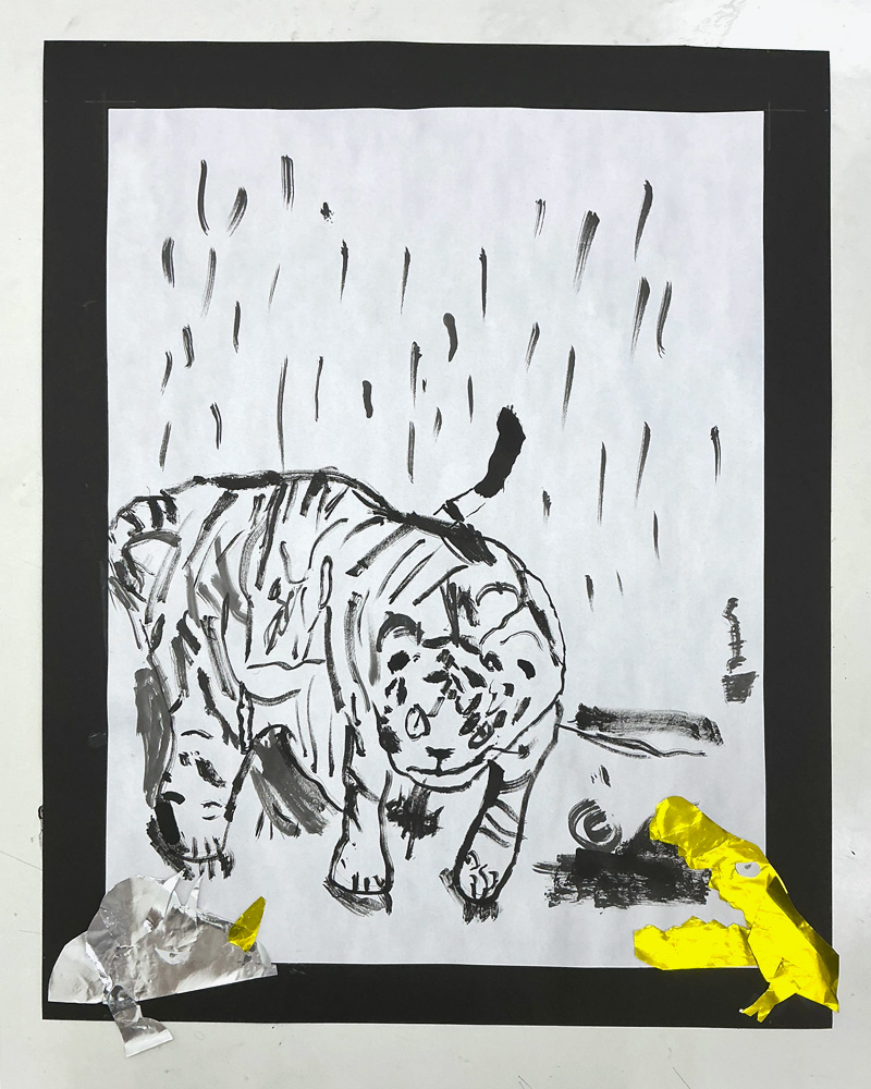 最後に、お気に入りの1枚を台紙に貼り付けて、さらに時間に余裕のあった子は色紙などでデコレーションを加えました。試行錯誤しながら何枚も作品に取り組んだことで、たっぷりと墨による白黒の世界を堪能することができました。