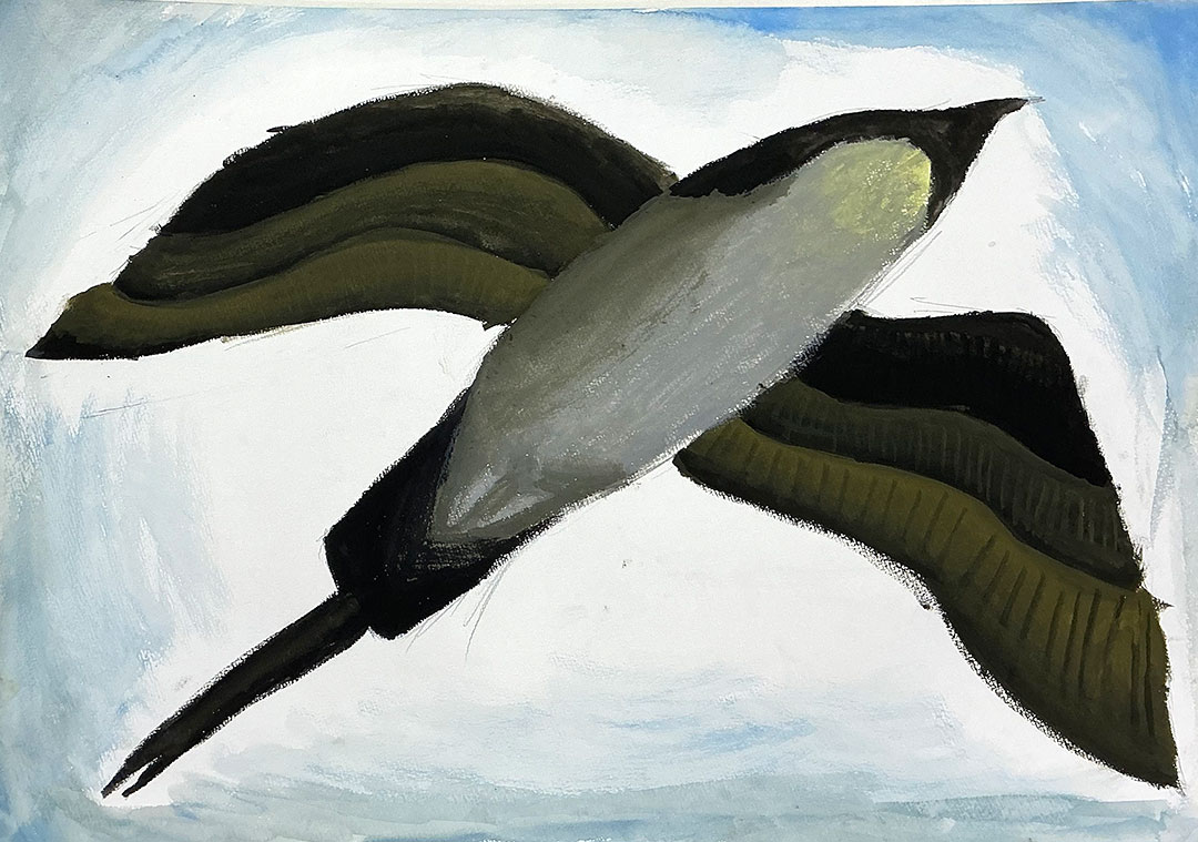 オナガが飛んでいる姿を水彩で描きました。翼の形や風切り羽根の一枚一枚までこだわってじっくりと描き切りました。