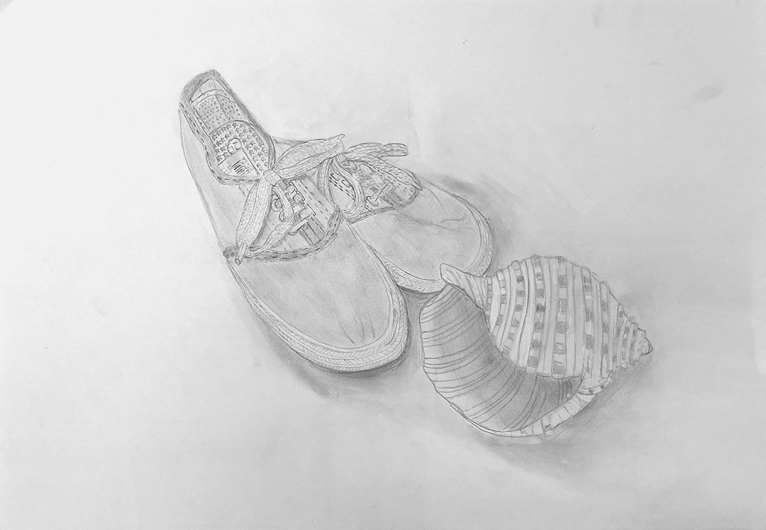6年生のデッサンの作品です。屋上の倉庫から、自分の描きたいモチーフを選んできました。巻貝の模様や、靴紐の細部まで丁寧に描きこんで、とても繊細な作品になりました。