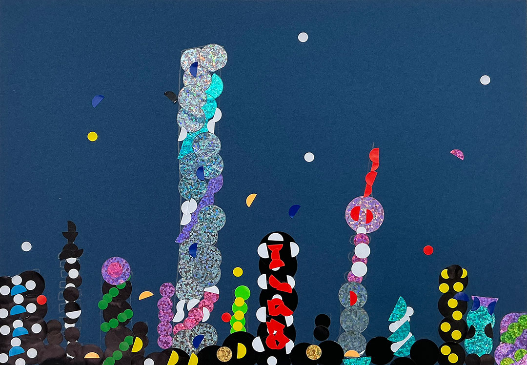 4年生のシールアートです。東京の夜景を色鮮やかに表現しています。半分にカットしたシールを星空や建物の一部に使うなどして、画面の中に形のメリハリをつけています。