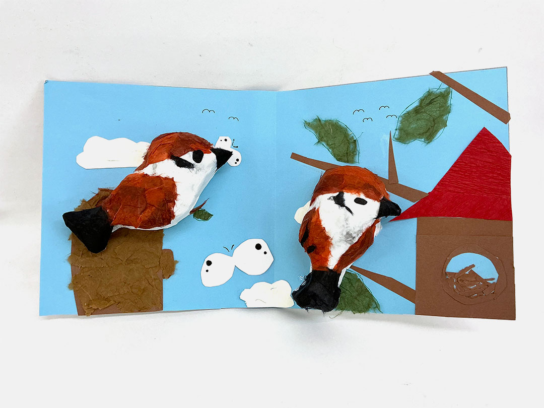 4年生の張り子の作品です。屏風仕立てで、左右に1羽ずつ小鳥が枝に止まっている様子を表現しました。左側の小鳥は、モンシロチョウを捕まえたのでしょうか。