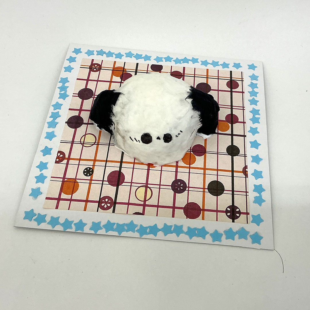 シマエナガが碁盤のような台紙の上にちょこんとのっていて、とても可愛い作品です。台紙の縁取りの星型まで、じっくりとこだわって作りました。