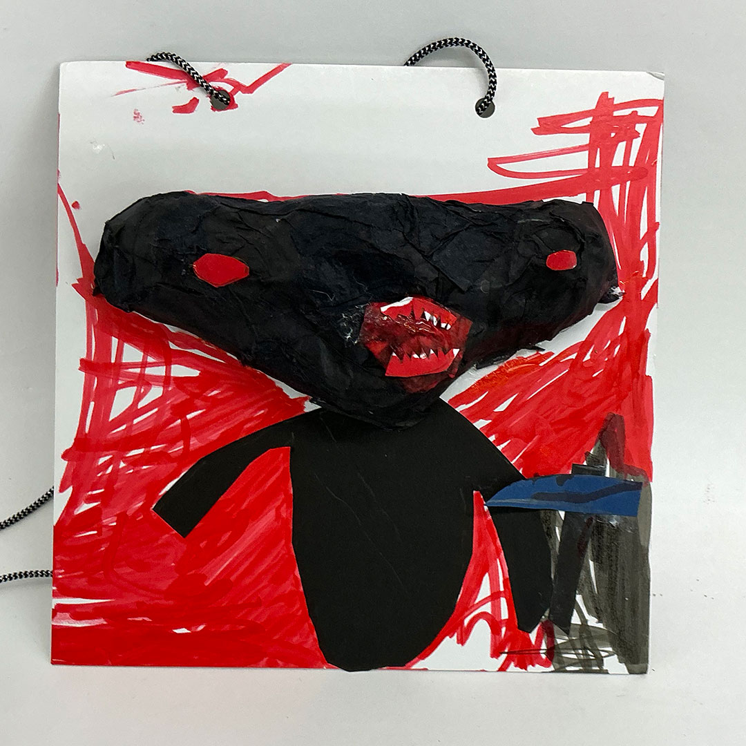 作者曰く「シュモクザメ人間」だそうです。真っ赤な目や口、背景が、血の色を思い起こさせて、怖さを引き立てています。